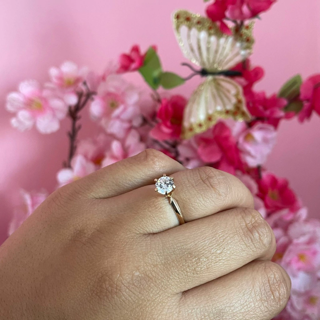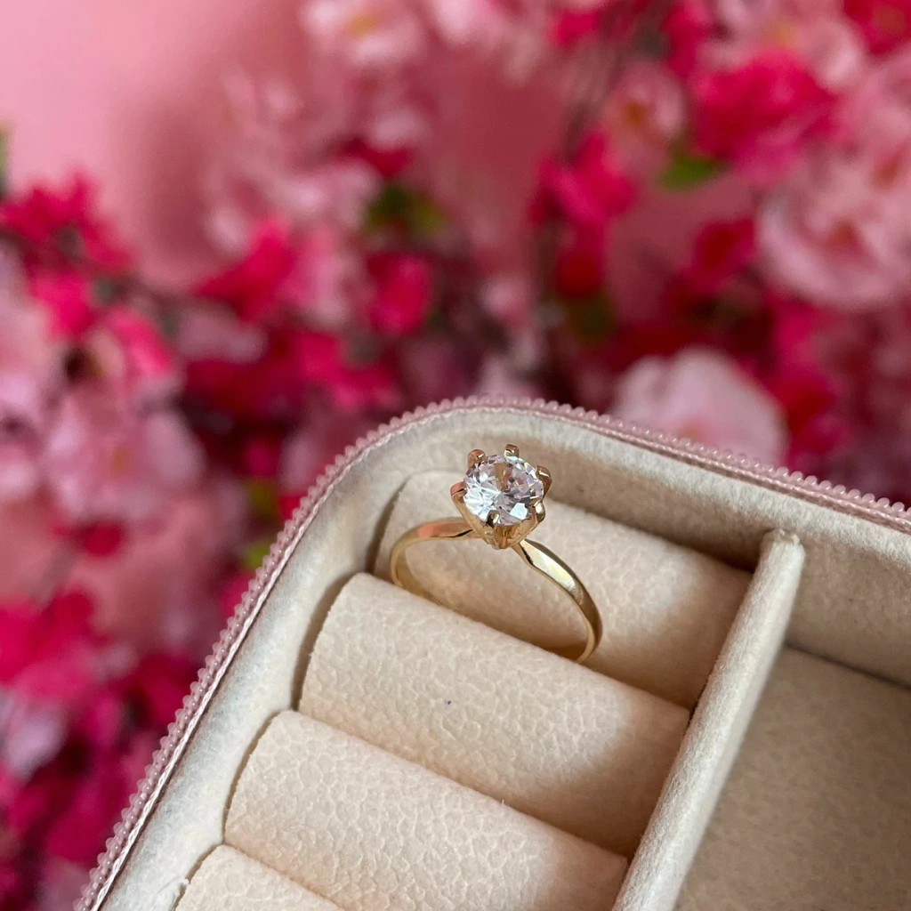 Clássico e elegante, este anel solitário banhado a ouro realça a beleza da pedra central lapidada com brilho delicado. Versátil e confortável, vai do dia a dia a ocasiões especiais, usado sozinho, com aparadores ou em composições (“stacking”).
