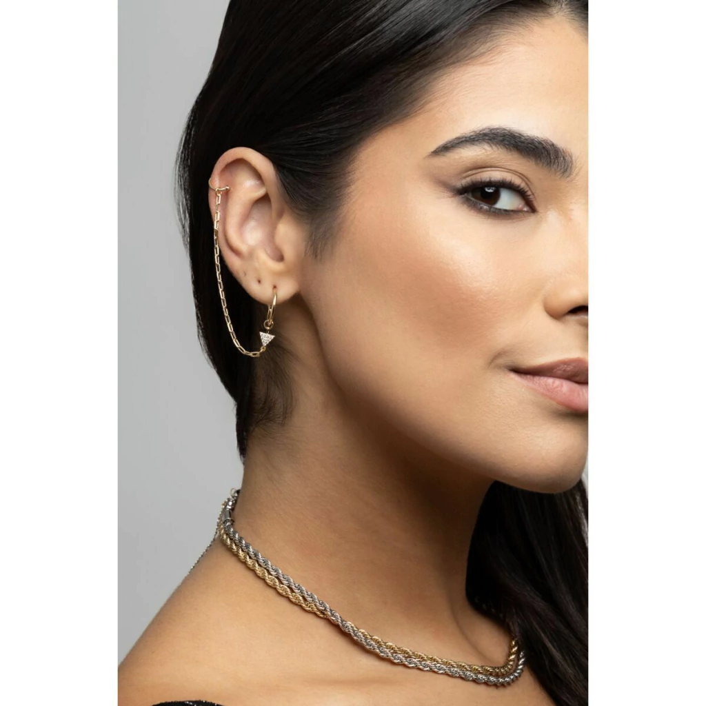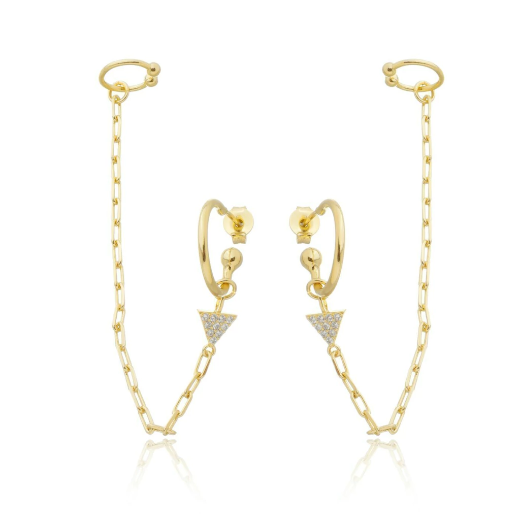 Elegância e modernidade em uma única peça! Com design contemporâneo, cravejado de detalhes brilhantes, este brinco é perfeito para quem ama estilo e sofisticação. O detalhe do piercing fake adiciona um toque ousado, sem comprometer o conforto.