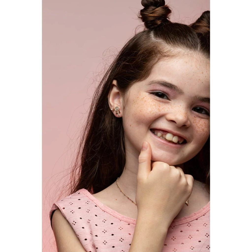 Doce e delicado, perfeito para a sua pequena se encantar! Feito com material hipoalergênico e acabamento de alta qualidade, traz um charme especial com o pingente de pirulito adornado com zircônia rosa.