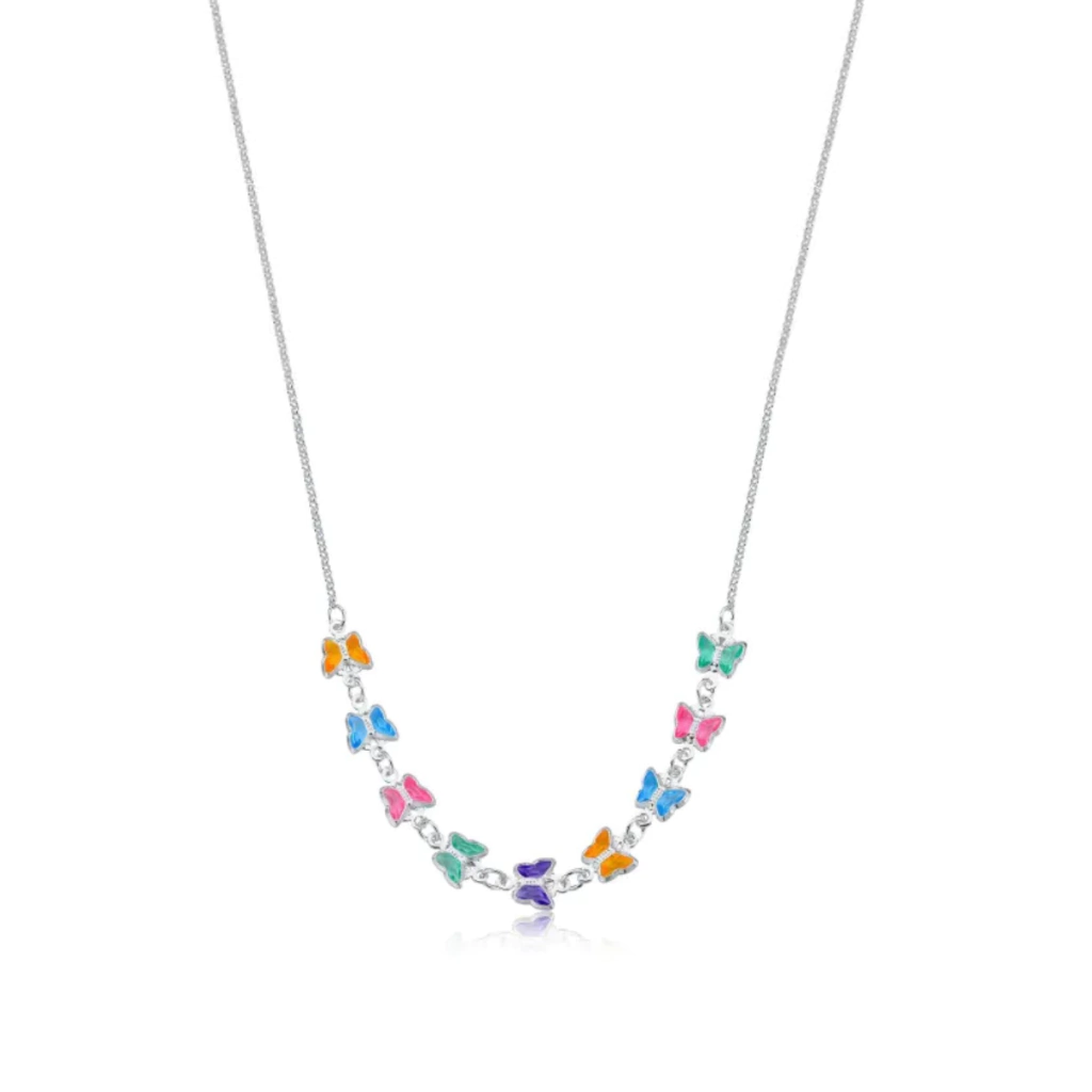 Este colar infantil em prata 925, com borboletas de cores avulsas, é perfeito para adicionar um toque de diversão e sofisticação ao visual das crianças. Com um design delicado e alegre, ele traz brilho e cor em cada detalhe, tornando-se uma escolha encantadora para quem busca uma peça única e cheia de charme.