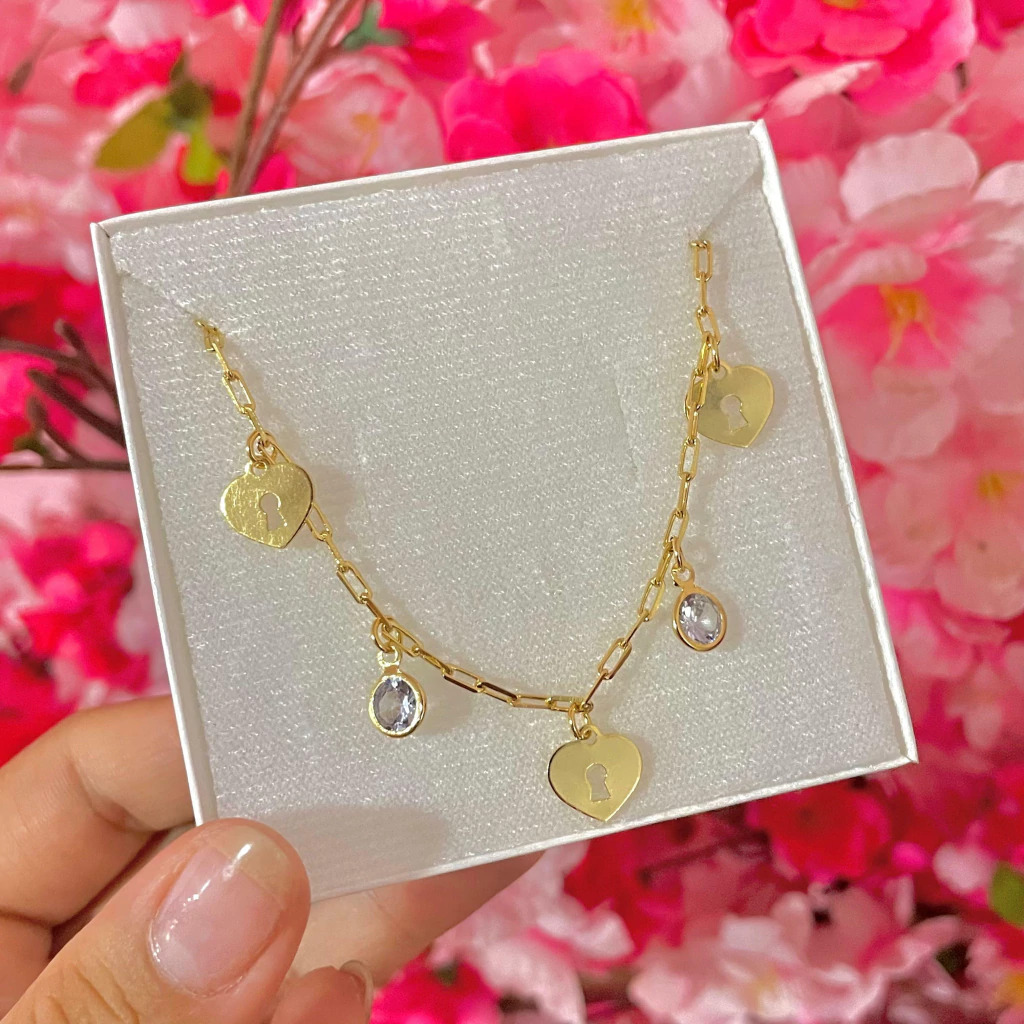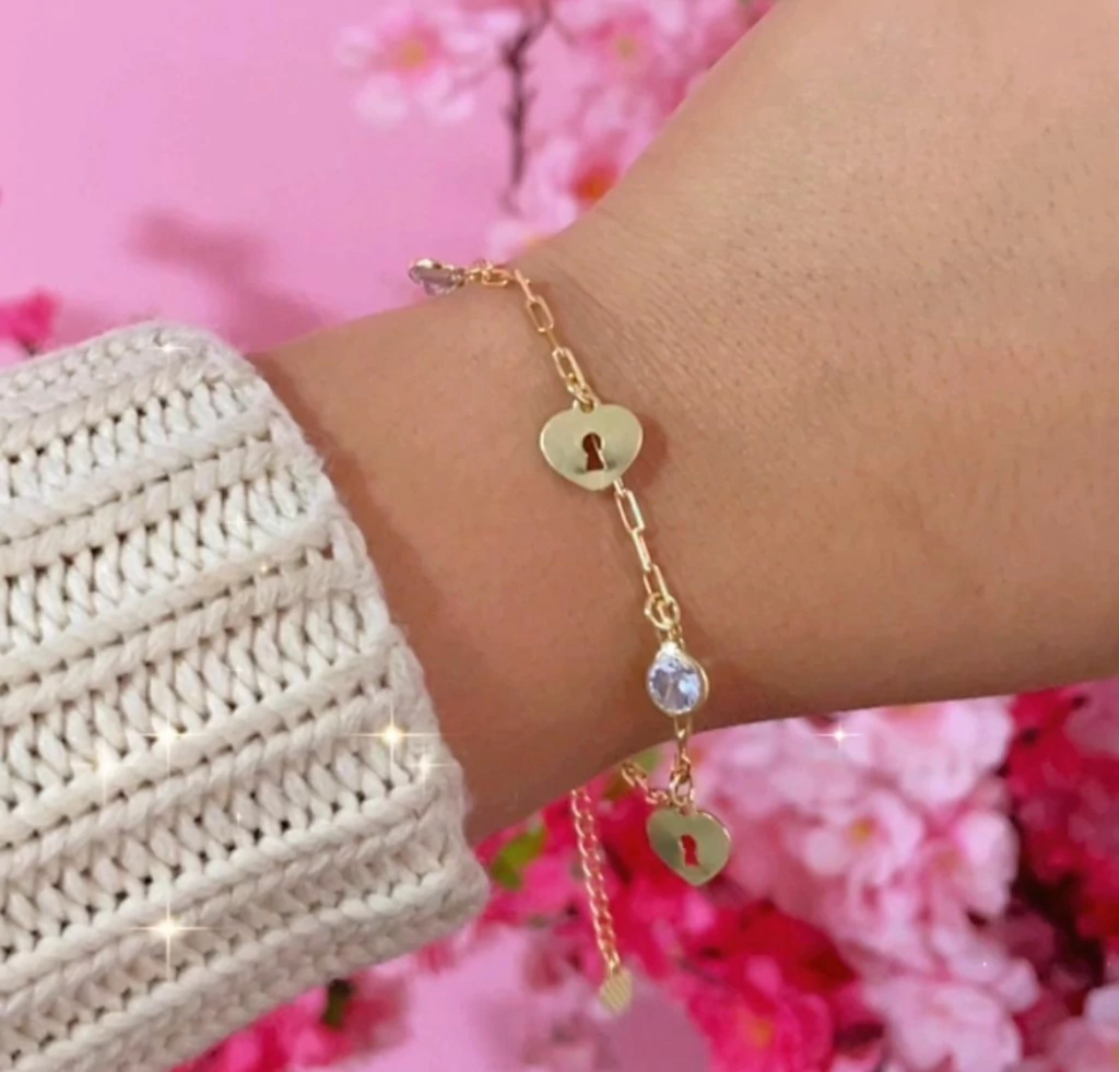 Romântica e estilosa, essa pulseira traz o charme do cadeado combinado com delicados corações, simbolizando amor e conexão. Banhada a ouro, é uma peça versátil que pode ser usada sozinha ou em mix, destacando-se em qualquer produção.