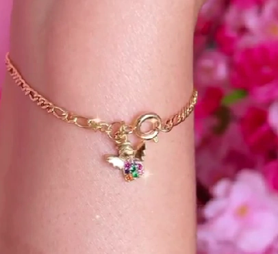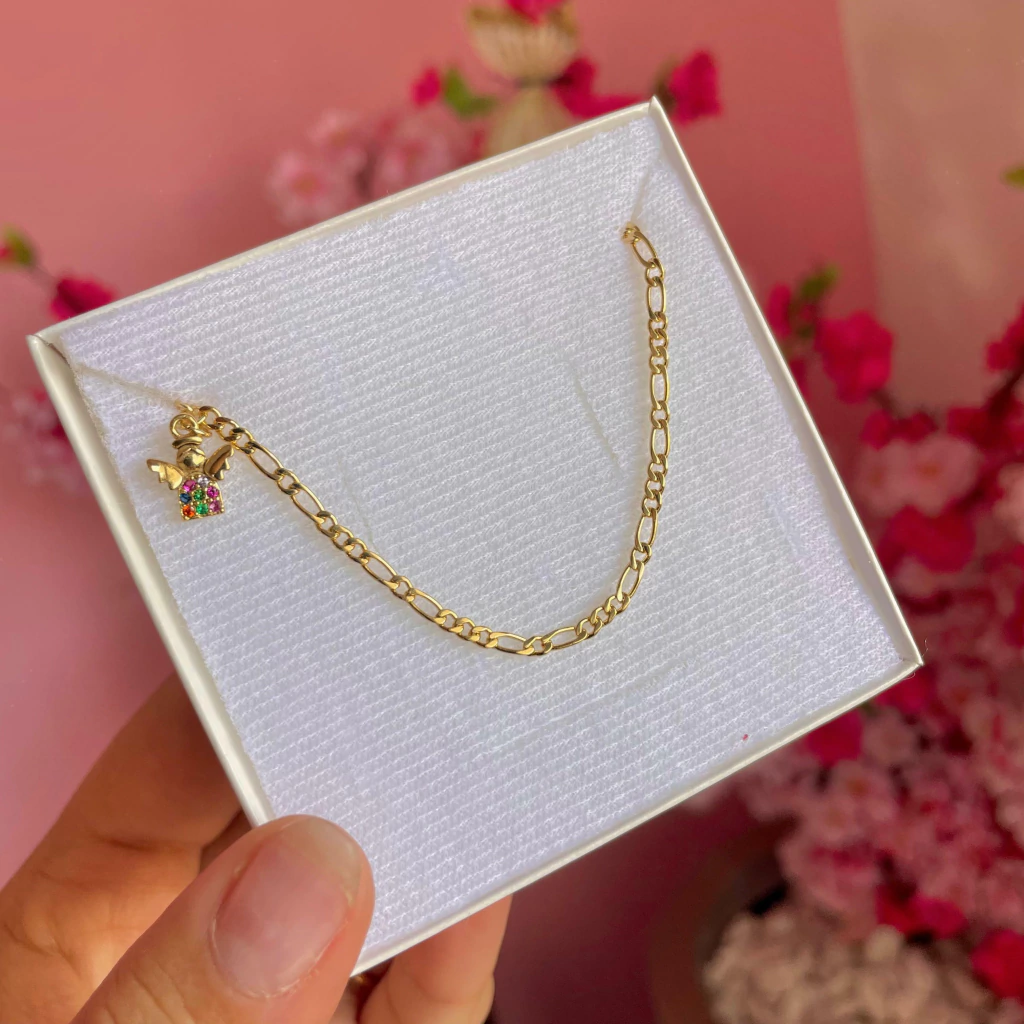 Delicada e cheia de significado, essa pulseira piastrini é banhada a ouro e traz um pingente de anjinho acompanhado de pedrinhas coloridas. Uma peça encantadora, perfeita para proteger e iluminar com muito estilo.
