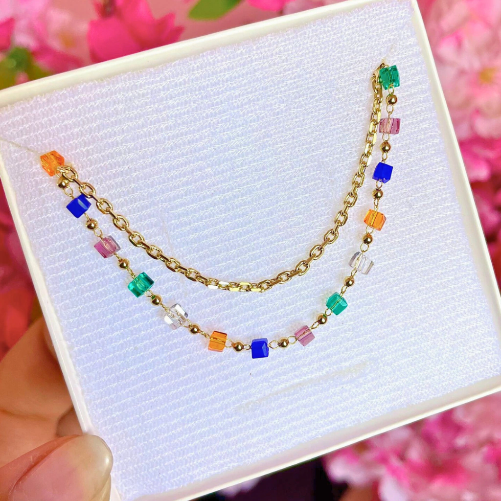 Charmosa e moderna, essa pulseira dupla combina a delicadeza dos cristais coloridos com a sofisticação da corrente tijolinho, resultando em um acessório único e versátil. Banhada a ouro, é perfeita para dar um toque de brilho e estilo em qualquer ocasião.