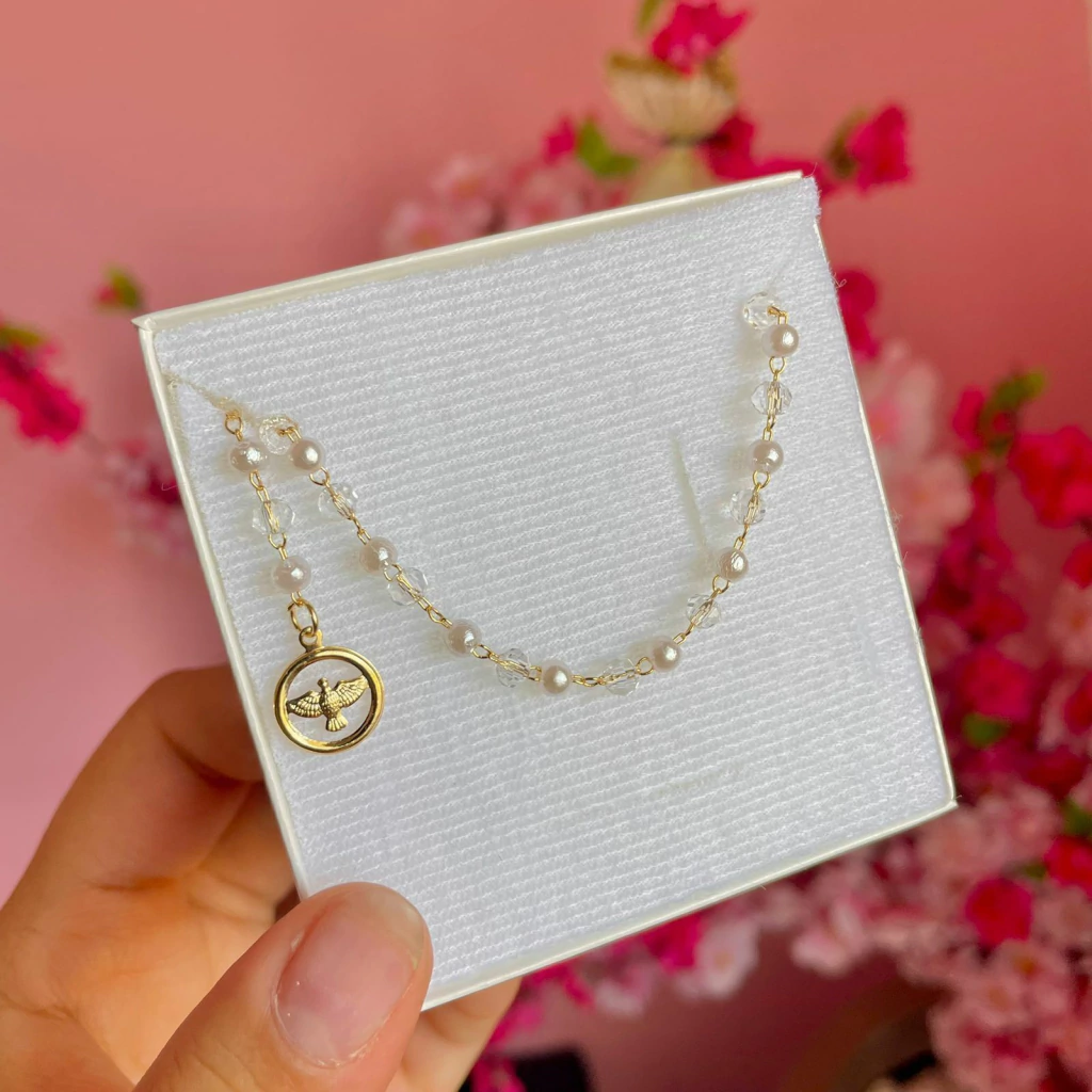 Uma joia delicada e cheia de significado. Essa pulseira banhada a ouro 18k traz a combinação perfeita entre a elegância das pérolas, o brilho dos cristais e o simbolismo do pingente do Espírito Santo, representando proteção e fé.