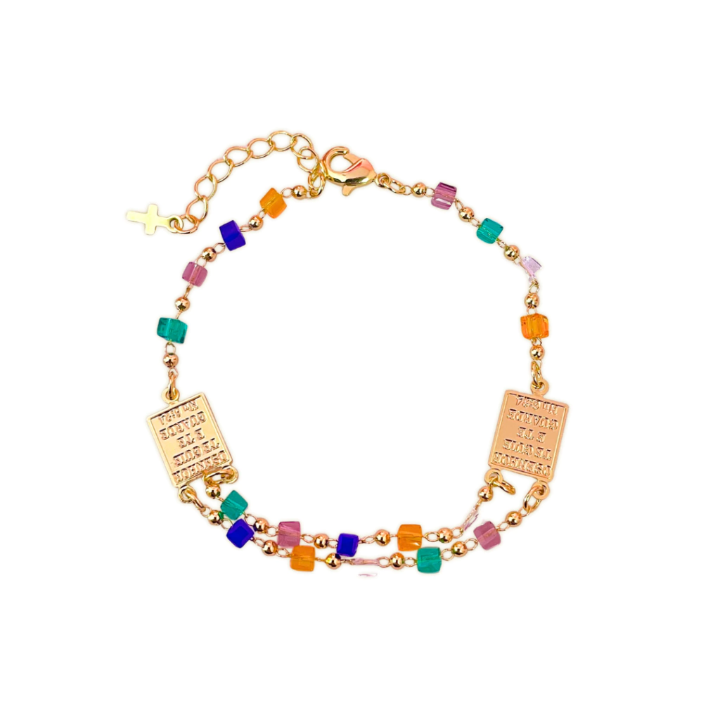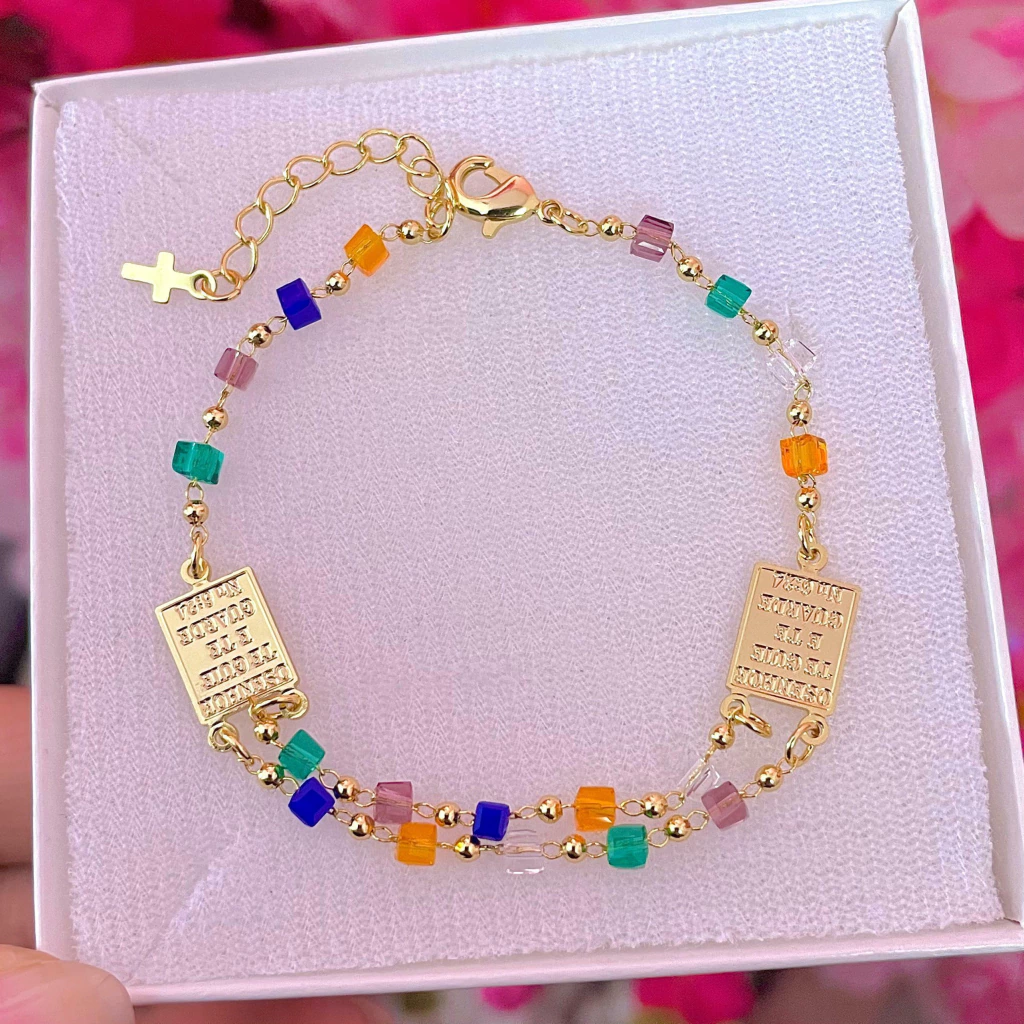 Um acessório de fé e estilo que traz significado e beleza em cada detalhe. Essa pulseira banhada a ouro possui delicados cristais coloridos, que adicionam um toque vibrante e moderno à peça, tornando-a perfeita para usar sozinha ou em mix com outras pulseiras.