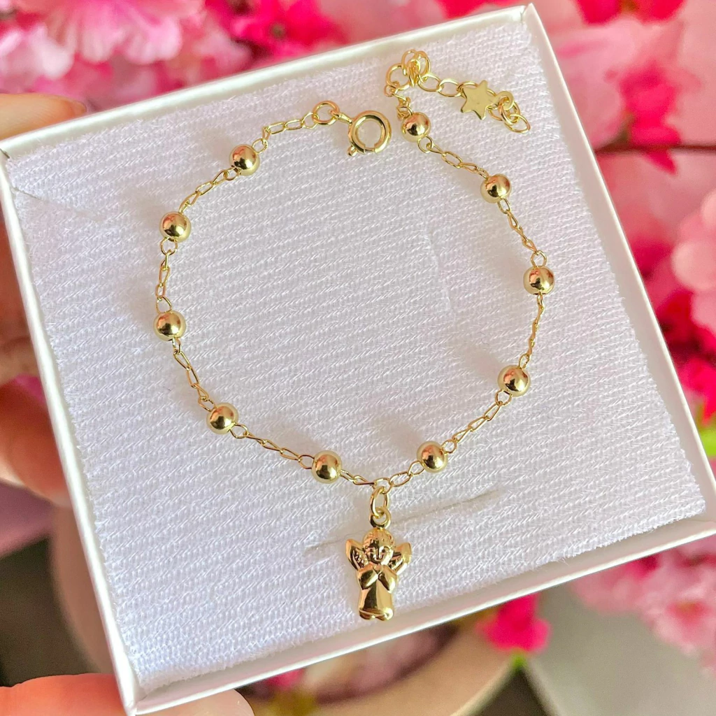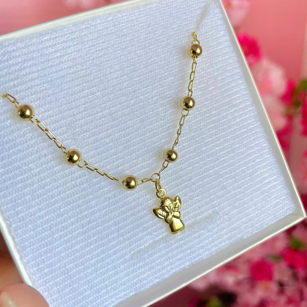 Linda e delicada, essa pulseira infantil é composta por bolinhas banhadas a ouro e um charm de anjinho pendurado, simbolizando proteção e carinho. Um acessório especial para deixar sua pequena ainda mais charmosa.