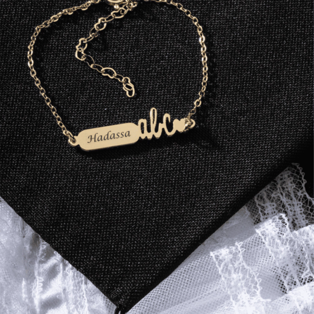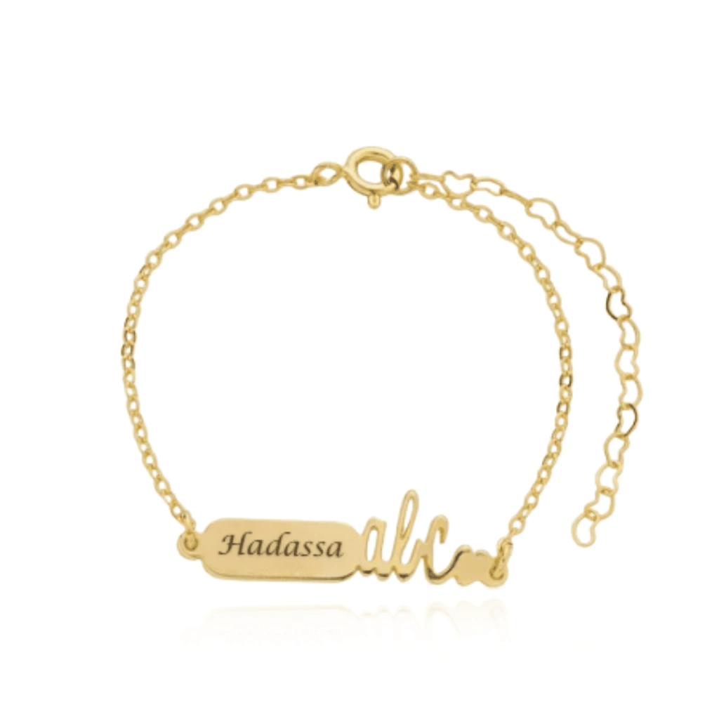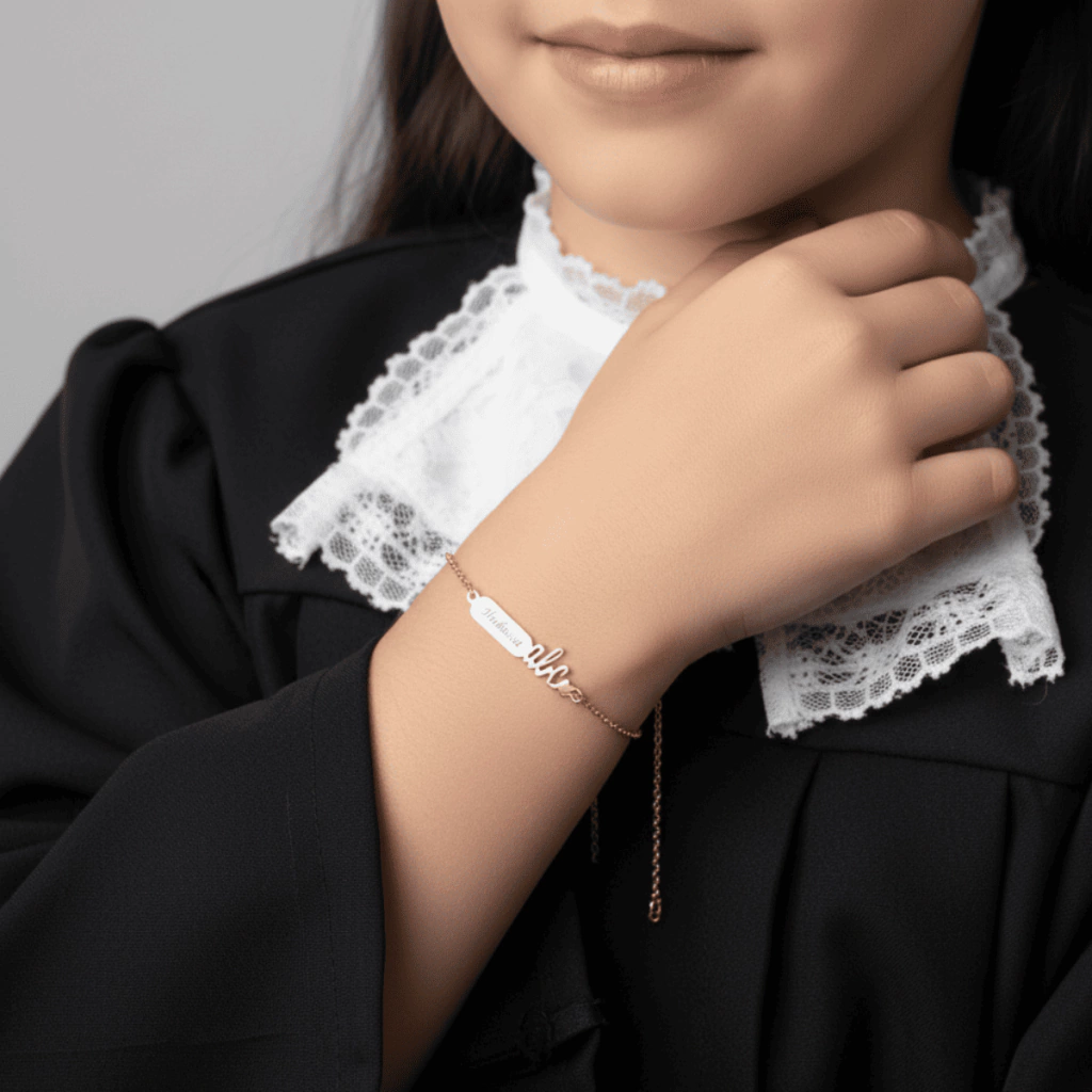 Pulseira infantil banhada a ouro de plaquinha ABC, perfeita para crianças que irão participar da formatura. Produzida com banho de ouro de alta qualidade e gravação a laser, garante acabamento impecável, brilho duradouro e personalização com total precisão. Além disso, é hipoalergênica, oferecendo conforto e segurança para a pele delicada das crianças.